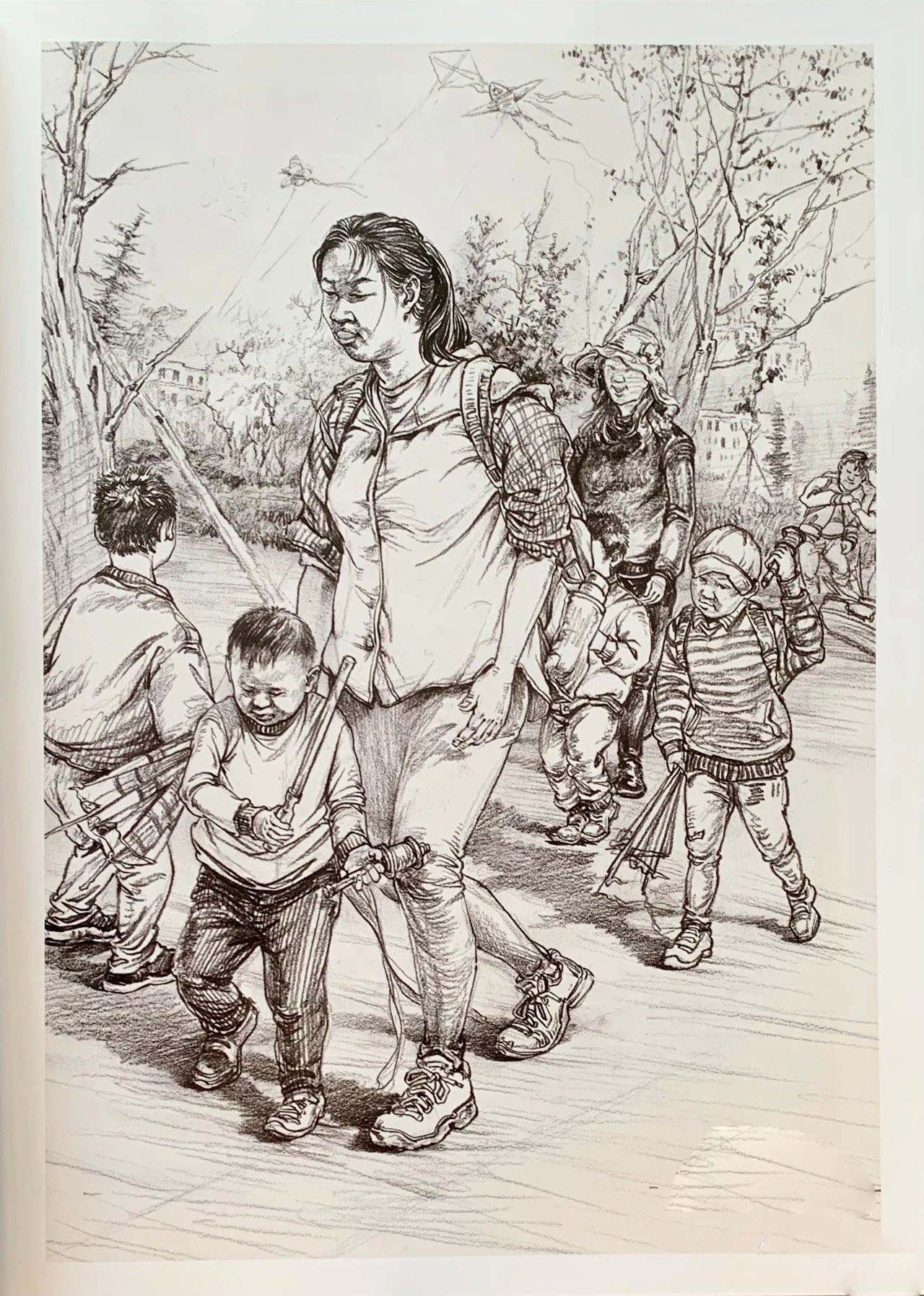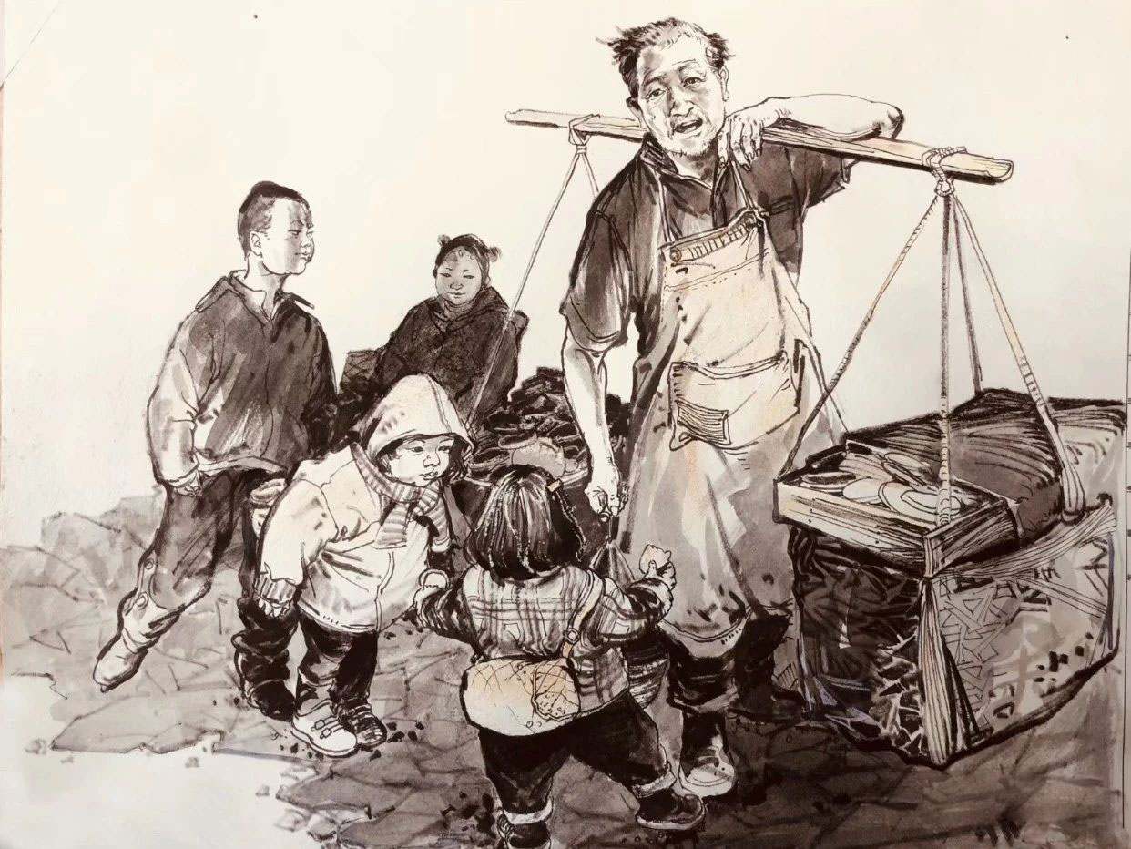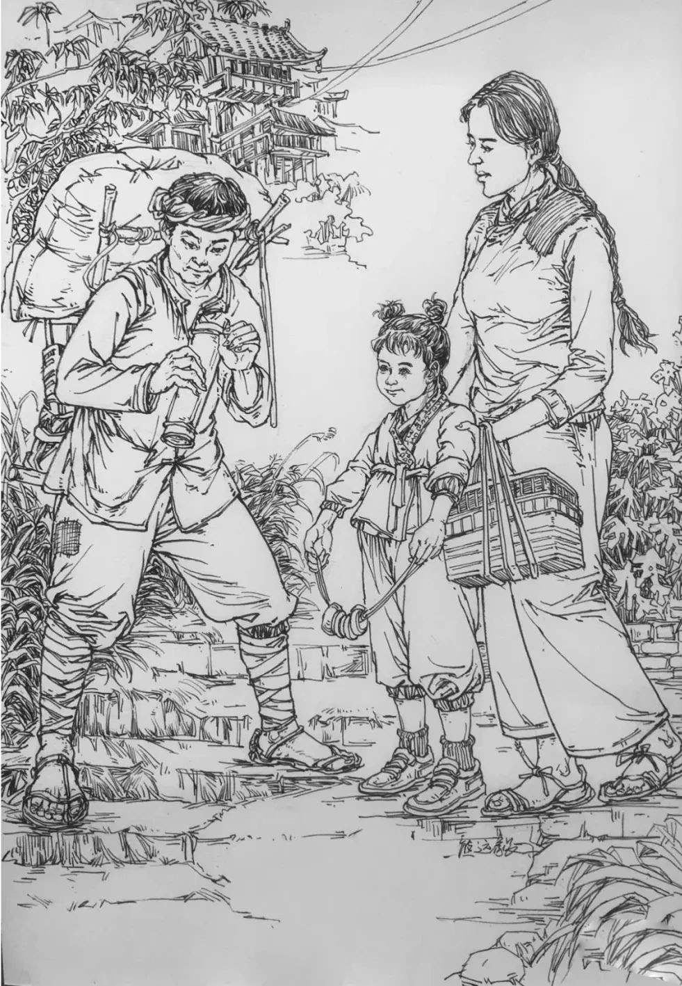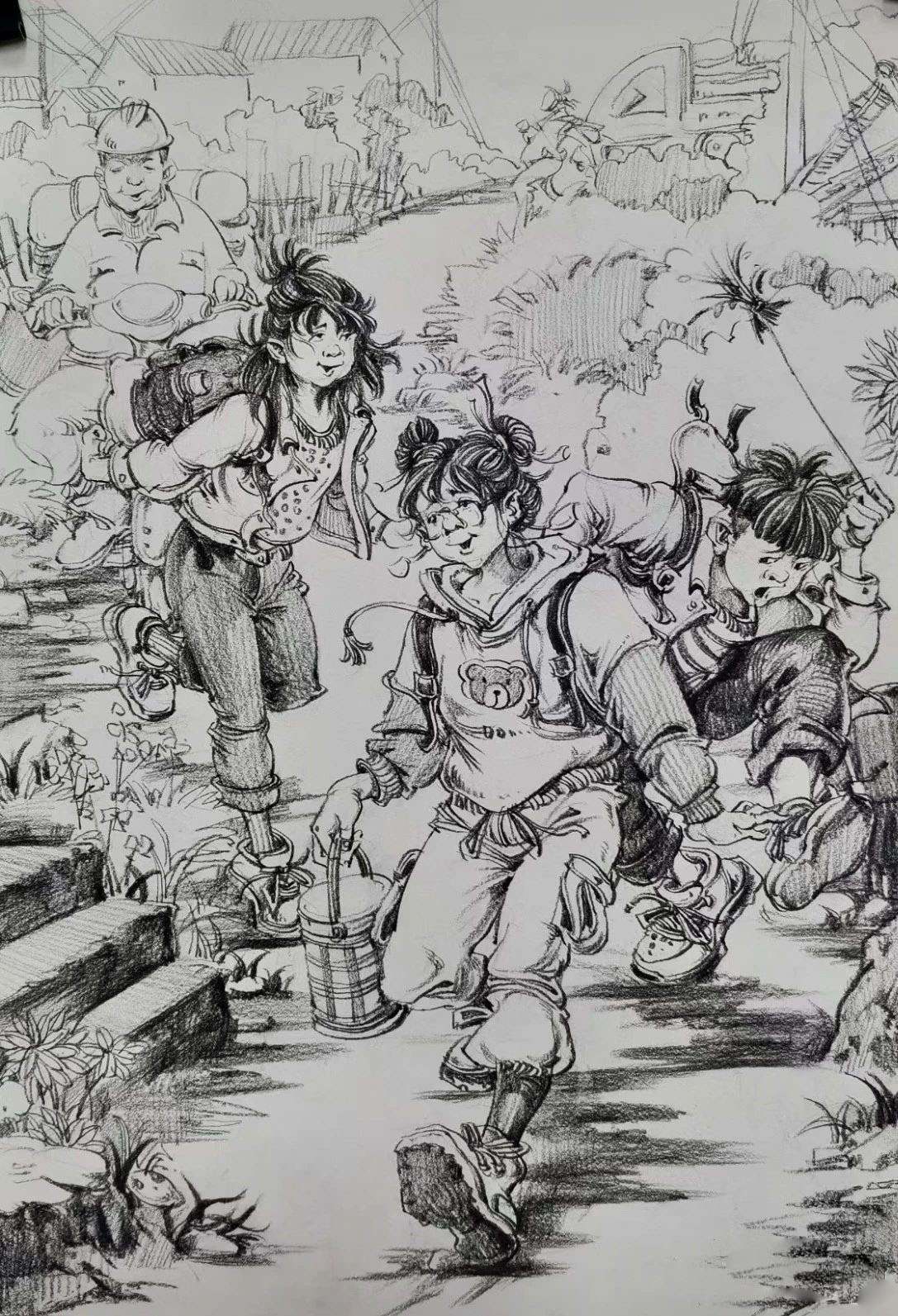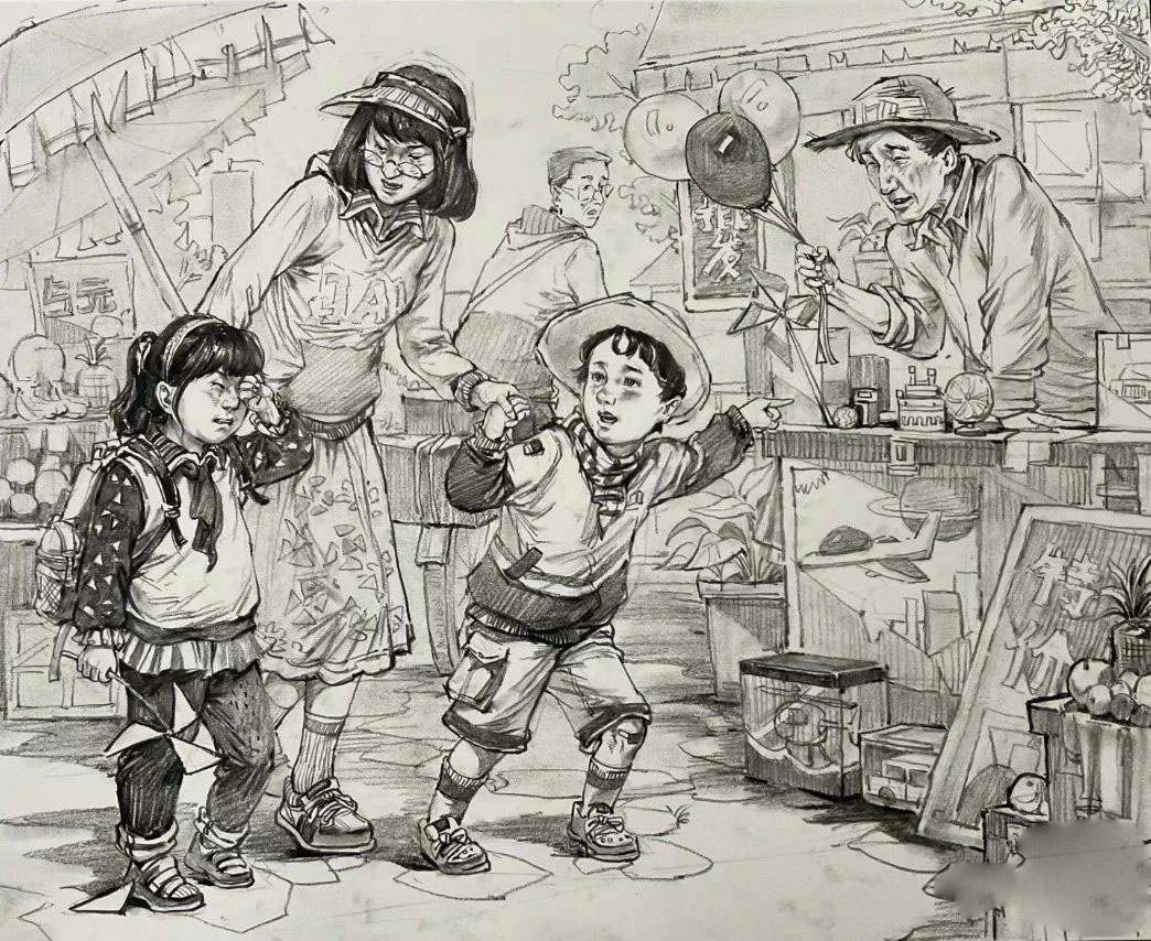 考題解析:考題是根據(jù)《市擔嬰戲圖》完成一幅以《嬉戲》為題的創(chuàng)作速寫,可以看到原作是以一個挑擔的人為視覺中心,左邊有一位母親帶著幾個孩子,以這張作品的構(gòu)圖來說,包圍這個主題是核心,然后我們看到考題要求是嬉戲,把剛才想的結(jié)合一下考題,我們就可以完成一幅類似場景的作品,一群小孩圍著一個大人玩游戲,這種場景應該是很好描繪的,可以看一下下面幾張范畫是怎么畫的,都是符合考題要求的。