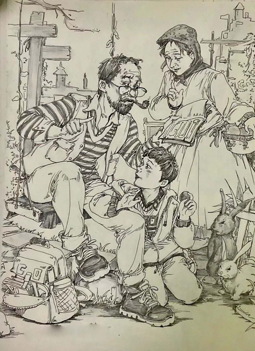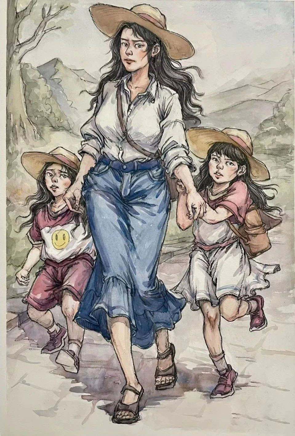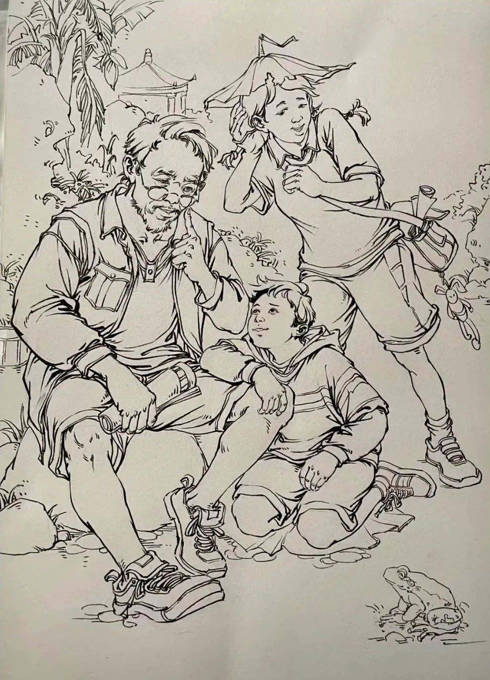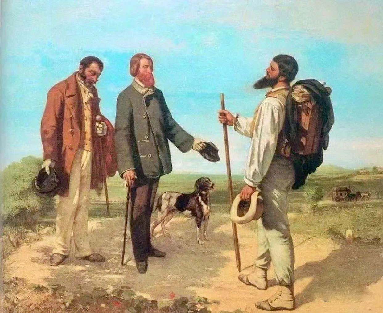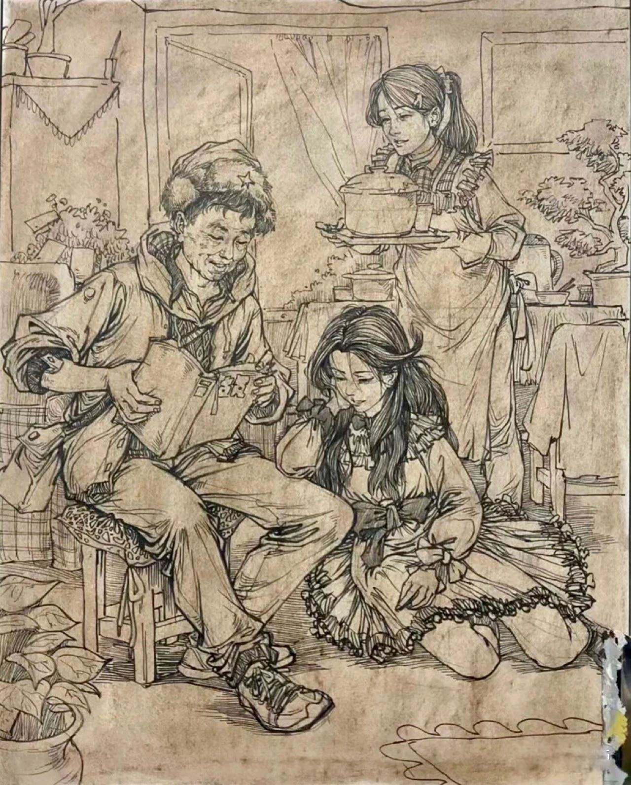 考題解析:第二幅作品是由三個人組成的,有一點問路的那種意思,也可以理解為相遇,這樣理解之后是不是就好畫很多了,我們的畫面只要是由三個人物組成,并且人物站位參考一下原作就基本符合題意了,如果想要畫面更有意思,就需要像下面這張范畫一樣,賦予人物職業(yè)性別和場景,這樣就會比常規(guī)的把三個人畫出來更有看點,分數(shù)也會更高。