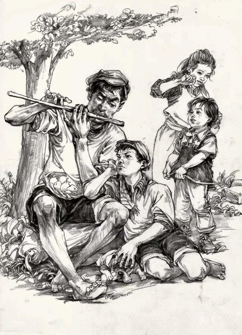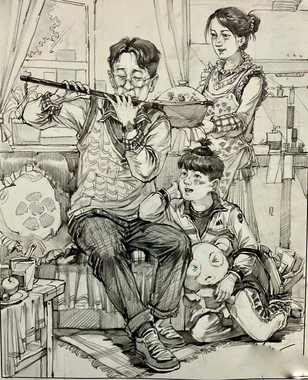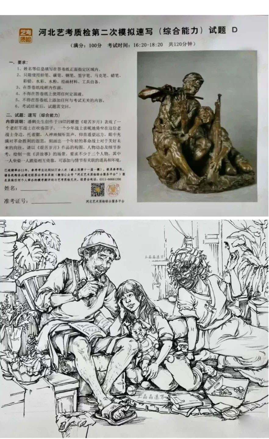 考題解析:最后我們來看一組以雕塑為題的速寫考題,《艱苦歲月》這個雕塑由一個坐著的人和一個趴在人身上的人為主,這兩個人物的動態(tài)就非常切合考題要求的《講故事》的場景,只需要把主要人物手上的樂器換成書籍就可以了,這種考題相對是比較簡單的,因為不需要你有太多創(chuàng)意,頂多是在場景和次要人物上做一些改變就可以了,要注意的就是人物的動態(tài)一定要生動,表情上也可以做大文章,要把那種溫馨的場景描繪出來。