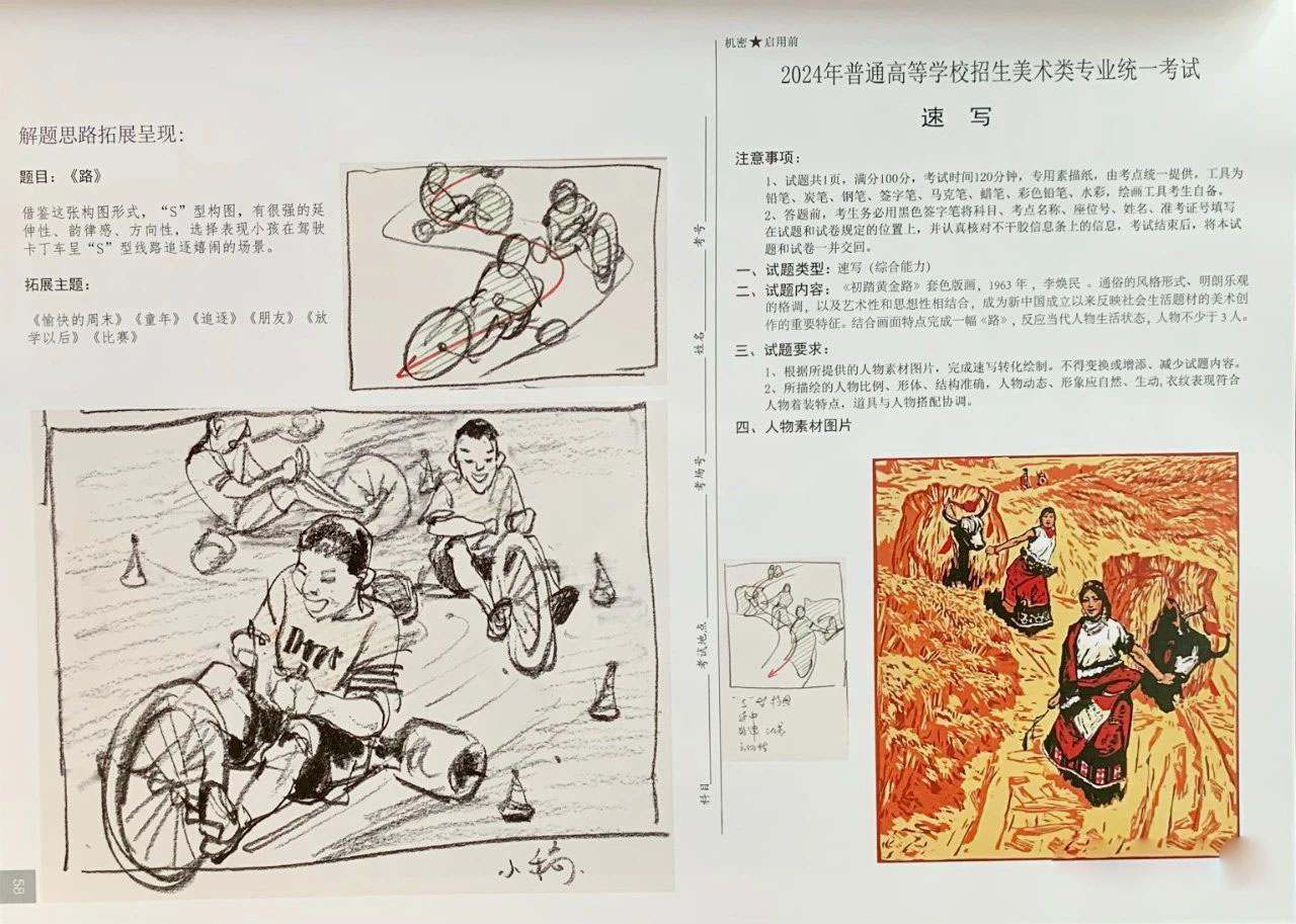 考題解析:考題要求是根據(jù)畫作《初踏黃金路》,創(chuàng)作一幅以《路》為題的創(chuàng)作速寫,人數(shù)不得少于3人,回到畫面,這張作品由兩個人物組成,走在“豐收的道路上”,那么這個考題要求的《路》就可以理解成兩個意思,一是簡單理解的道路,比如回家的路,上班的路等等,這個很好理解,第二個意思就是有收獲的路,比如農(nóng)民豐收了回家的路,考試成績很好回家的那種興奮都可以融入到畫面中,具體想要畫得出彩就要看你是否有更好的創(chuàng)意和構(gòu)圖了。